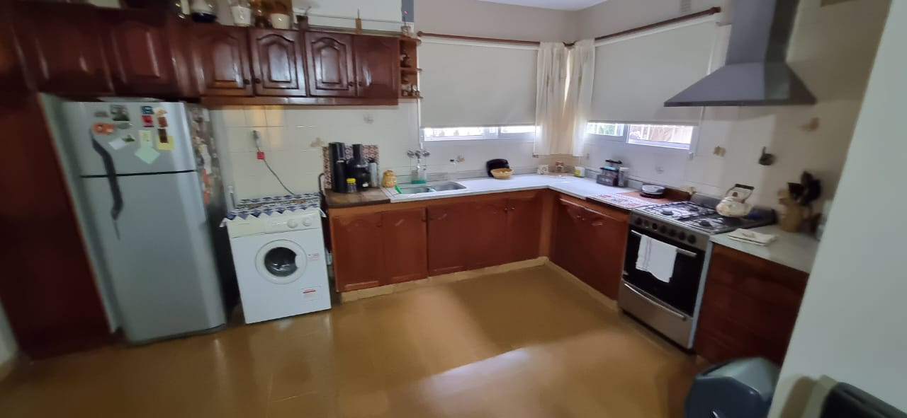 La casa tiene un jardin y porch al frente, accedemos al living que conecta en L al comedor amplio y al final encontramos la cocina con gran muobiliario de madera bajo y alacenas, con mesa para comer diario. Tiene 3 dormitorios amplios y un baño.