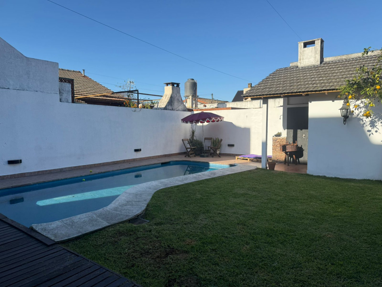 Parque con pileta de 3 x 7 y deck de madera .En el fondo habitación guarda útiles y baño. Ducha exterior