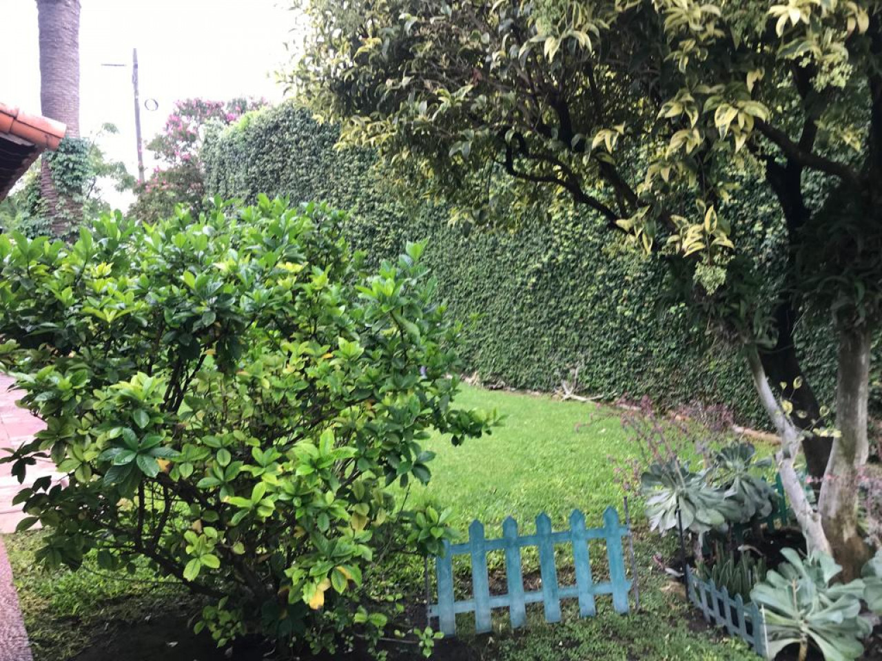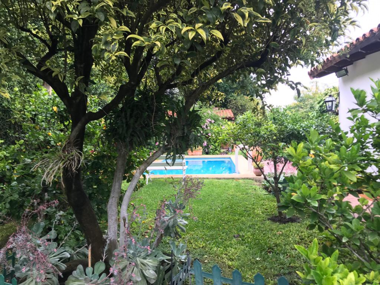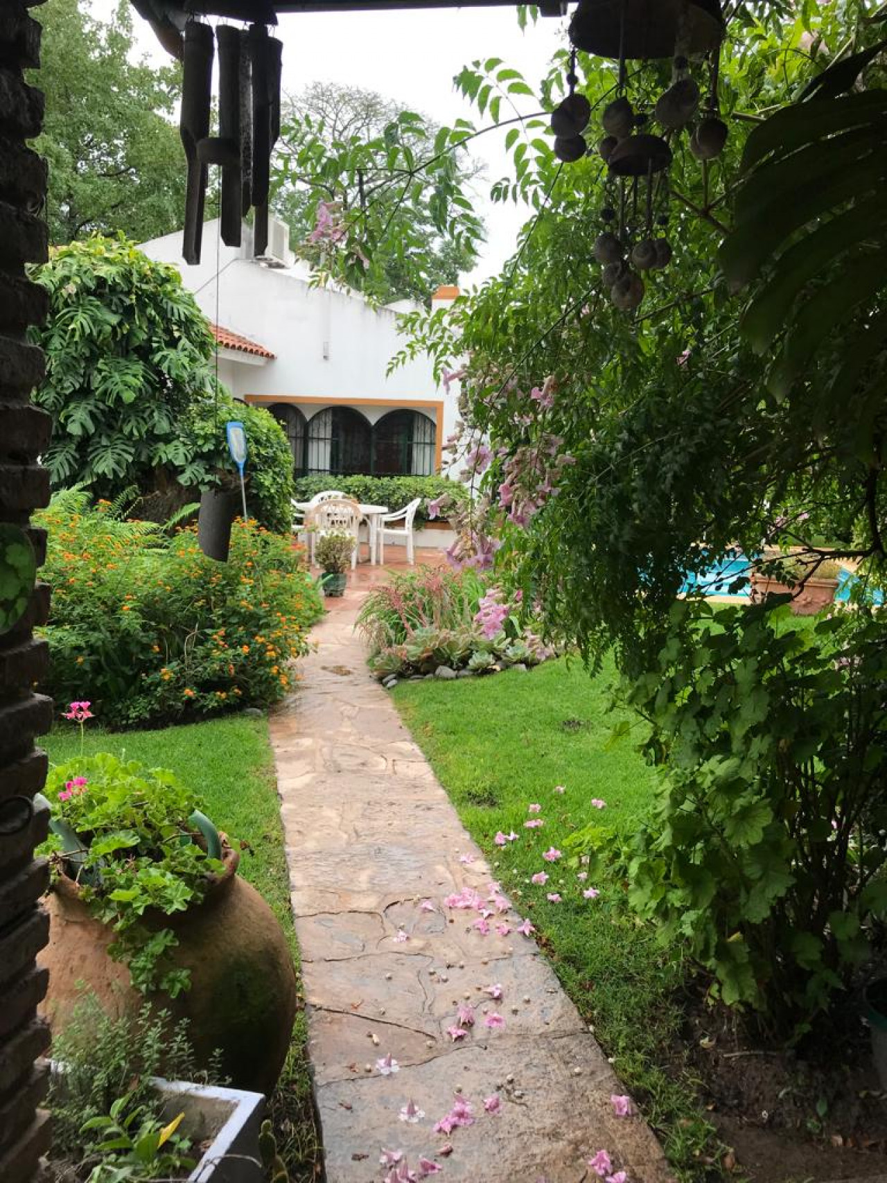 Exterior: Exuberante jardín con piscina, parrilla y senderos de piedra, perfecto para disfrutar al aire libre.