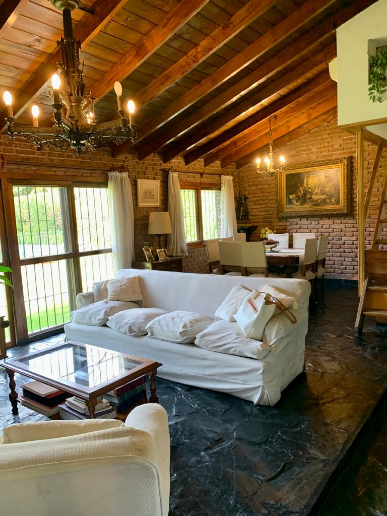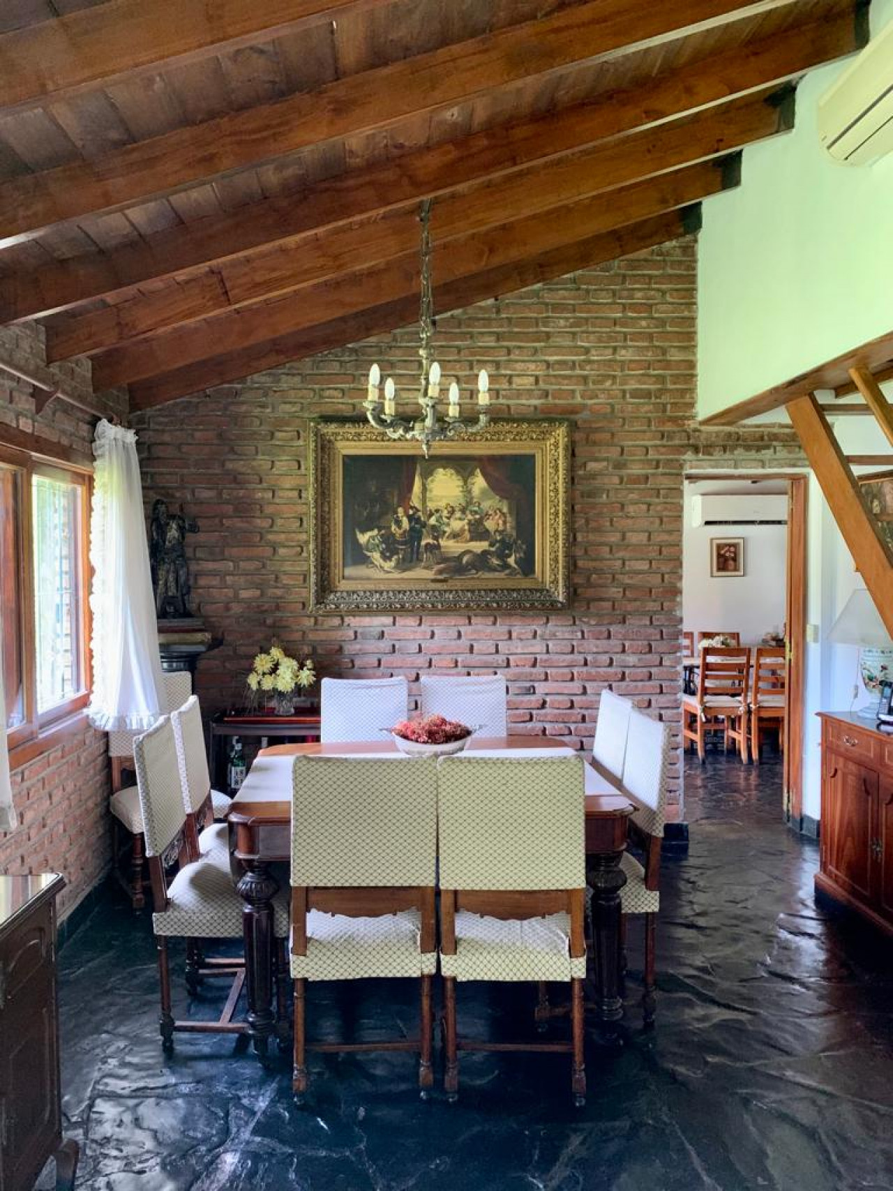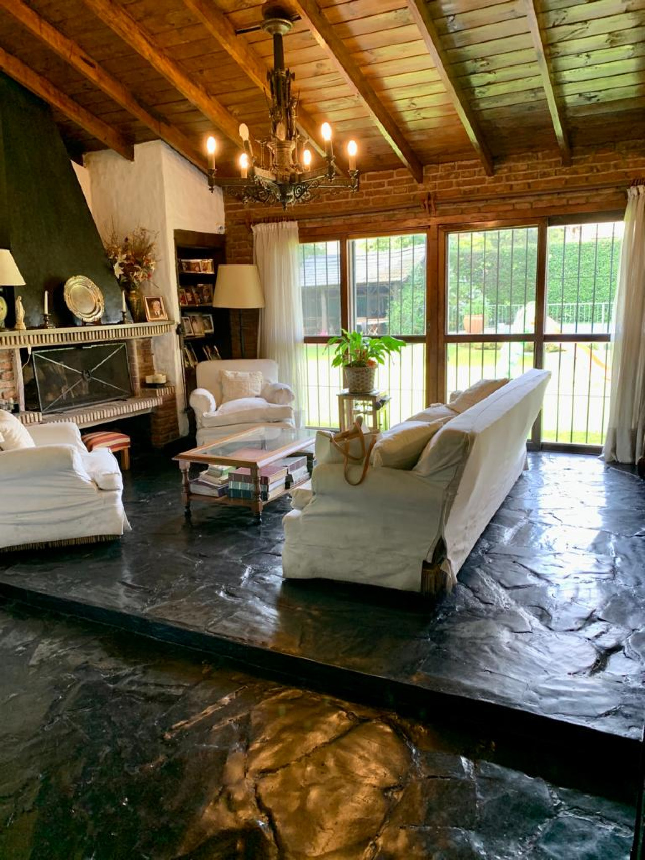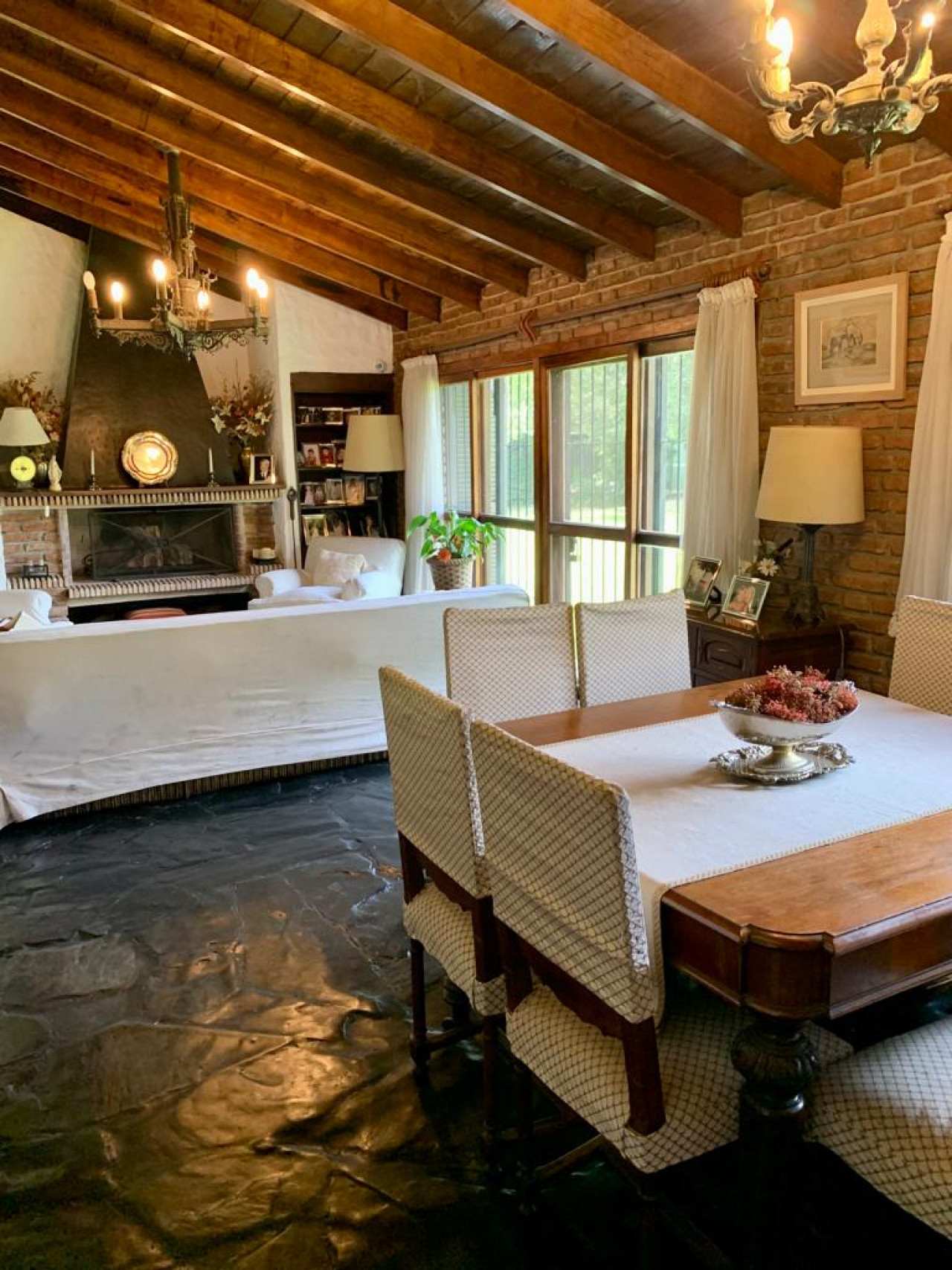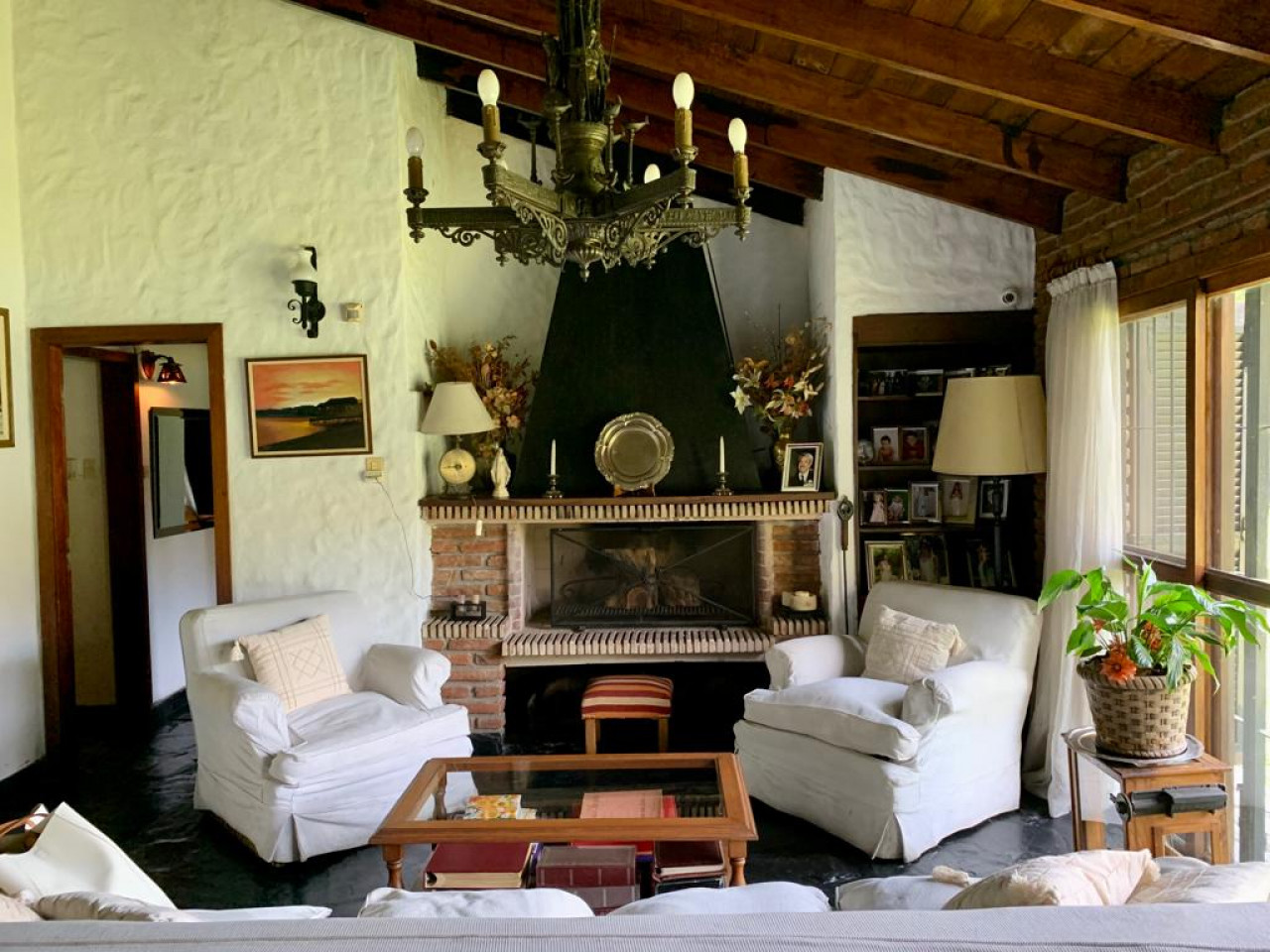 Casa en una planta, con living comedor en desnivel con gran hogar a leños, aberturas en madera,