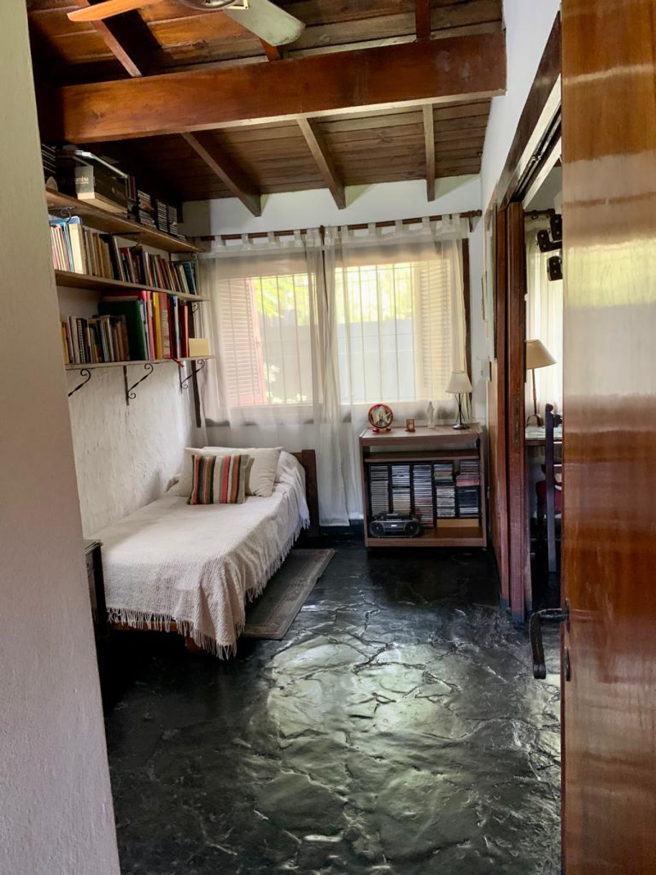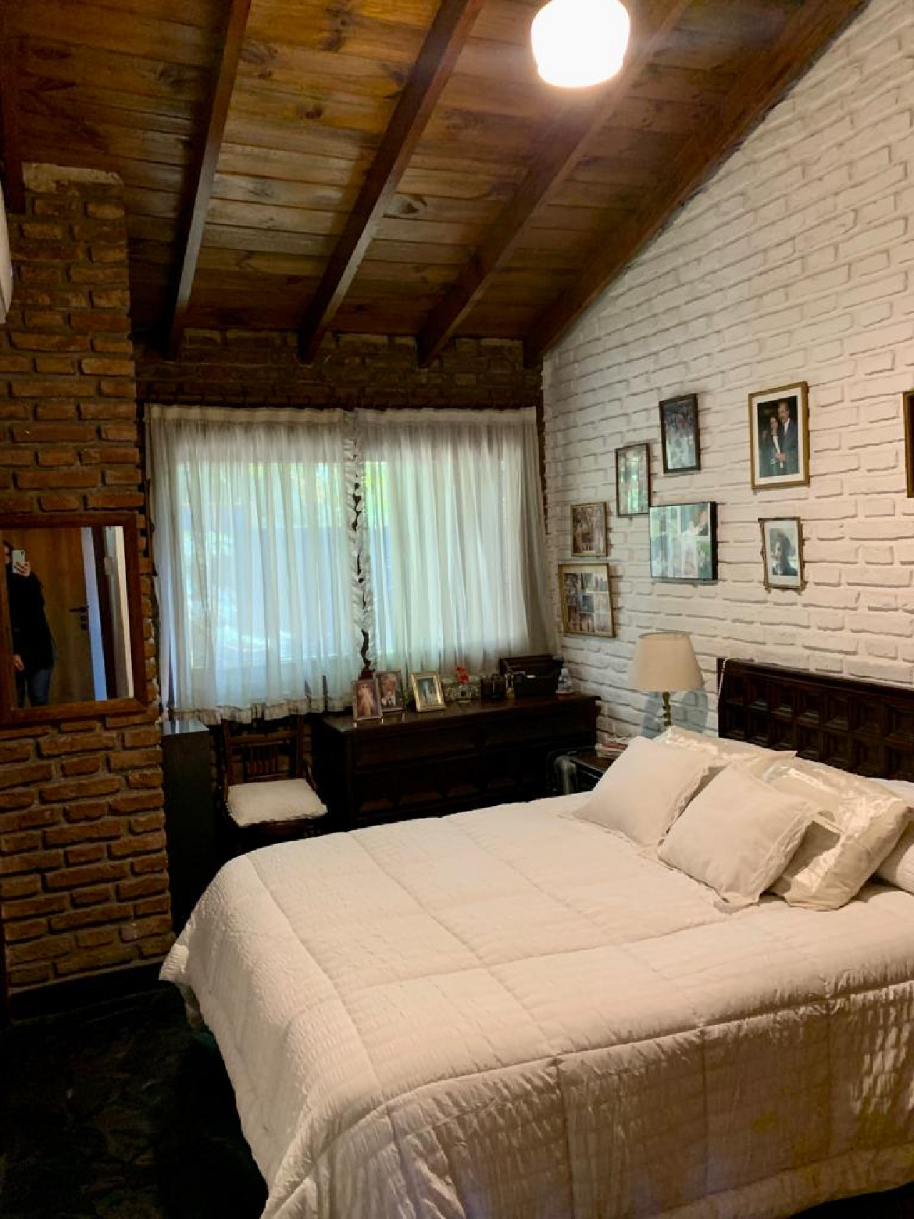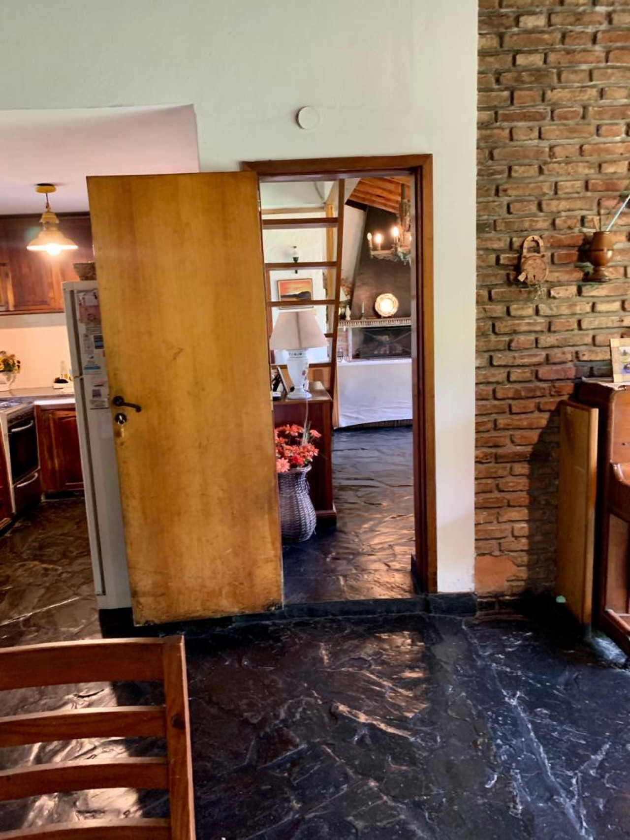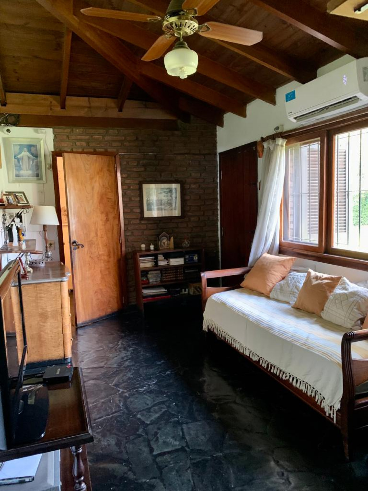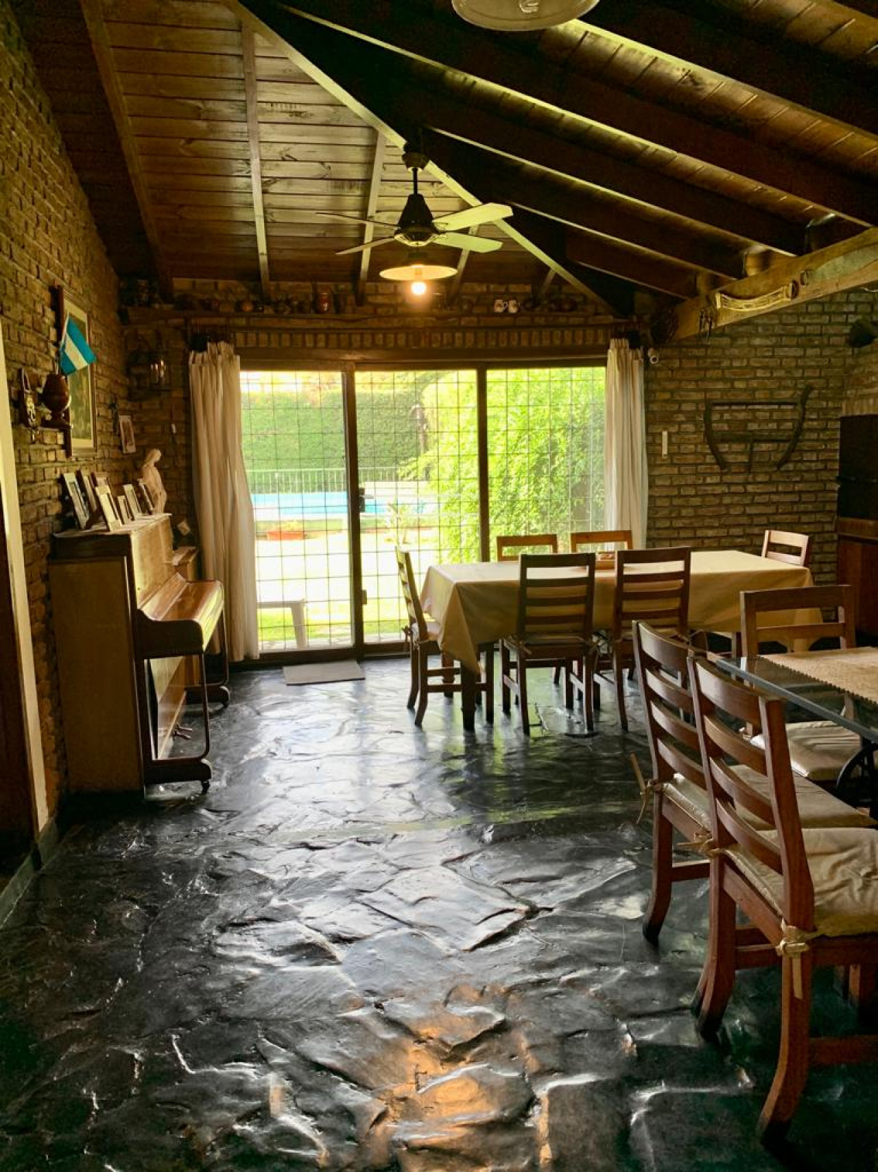 Casa en una planta, con living comedor en desnivel con gran hogar a leños, aberturas en madera,