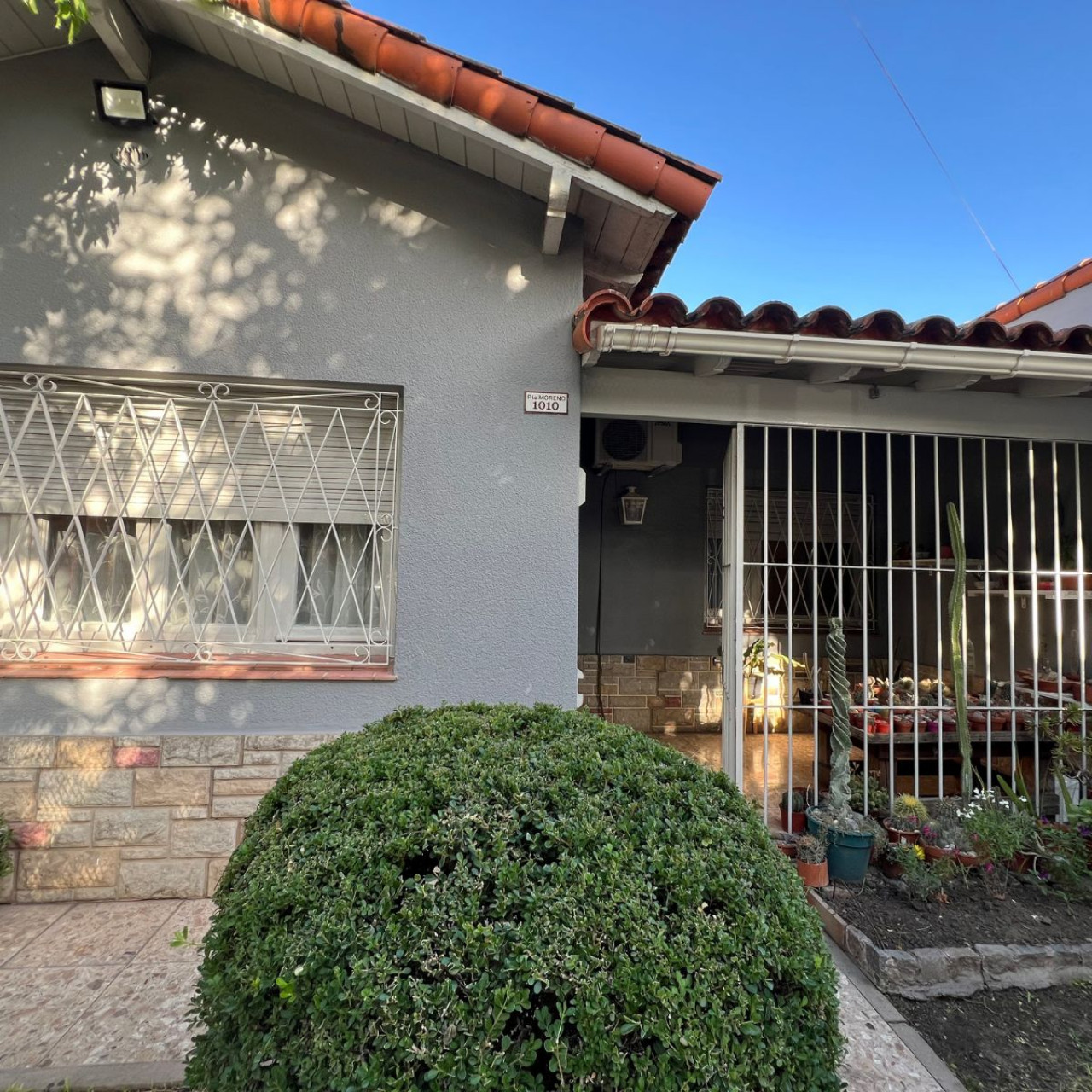 Jardín arbolado al frente con rejas y porche asegurado