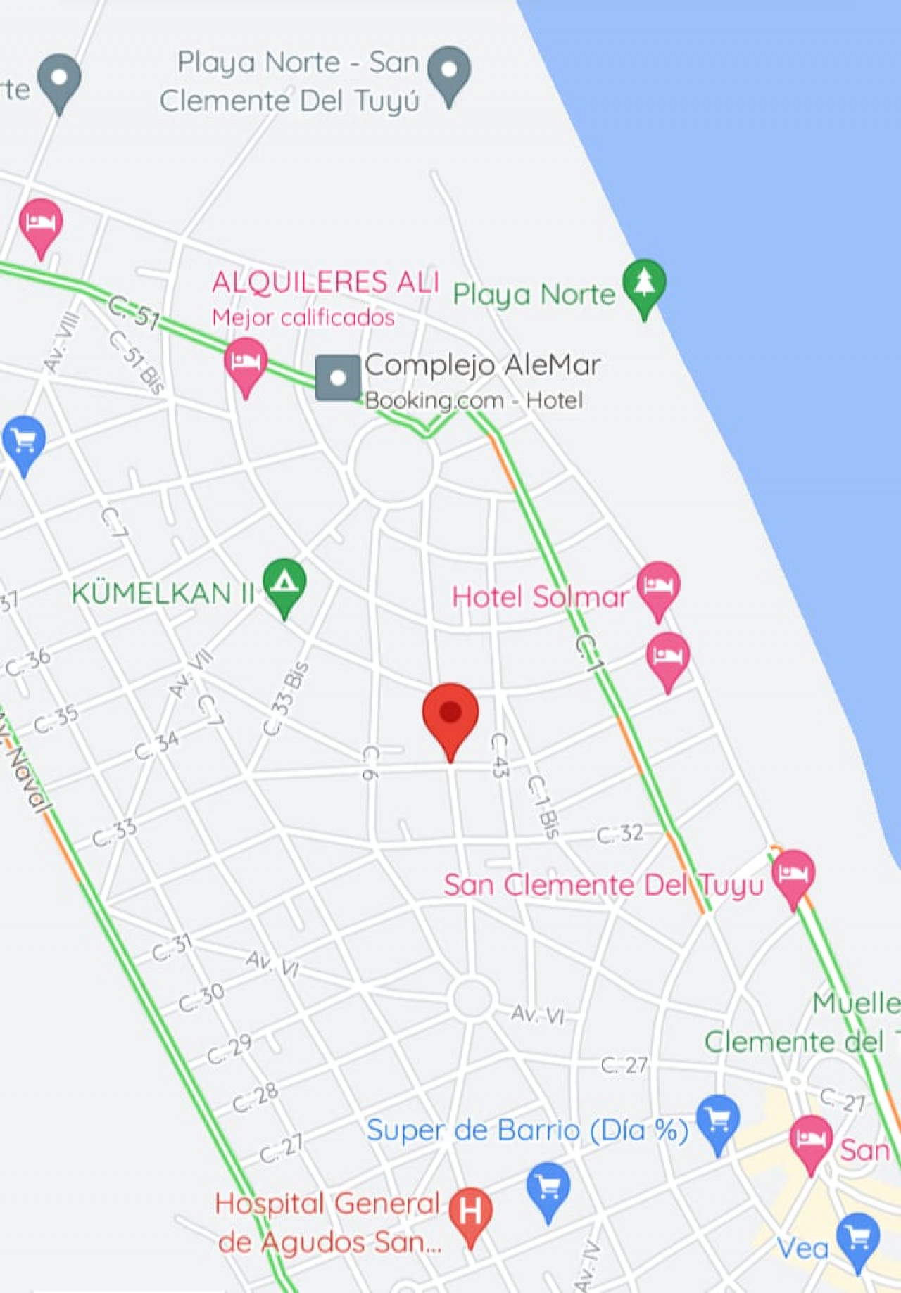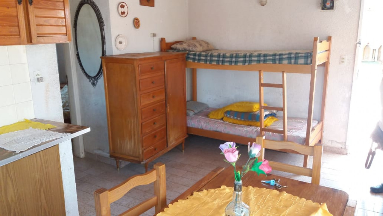 Departamento de 2 ambientes en San Clemente del Tuyú. Ubicado en la planta alta con vista a la calle, en la esquina de calles 33 y 44, a 3 cuadras del mar y 5 cuadras del centro. Consta de living comedor con cocina integrada, baño completo con ducha, 1 habitación.
