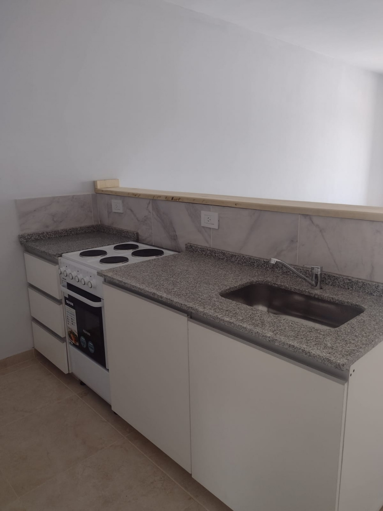 Departamento monoambiente con placard y sus interiores, cocina con anafe 4 hornallas y horno (eléctricos) amoblamiento de cocina bajomesada, termo eléctrico, baño completo, y balcón. Todo eléctrico. Se encuentra a 20 mts. de Av. Perón , sobre la calle Letonia al 1100 .