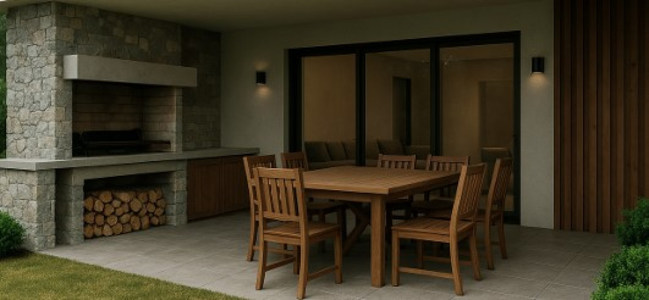 Galeria con parrila creada con materiales nobles, como piedra natural en la chimenea y detales en